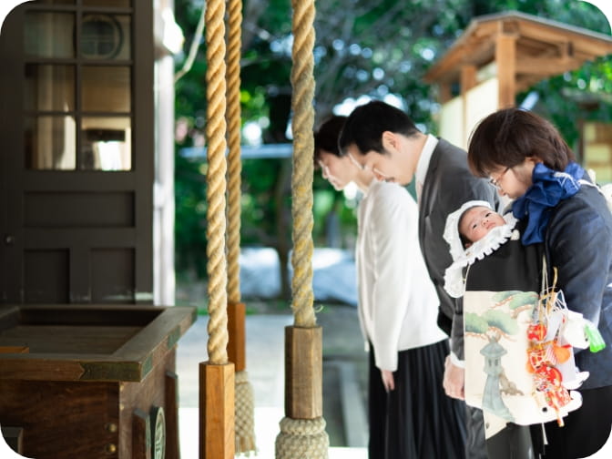 日本には赤ちゃんの誕生と健やかな成長を願って、生誕約1か月目に両親と父方の祖母が付き添って神社にお宮参りをする風習があります。古くは男児32日目、女児33日目に乳母または親戚の女性が抱き、その上に宮参り着と呼ばれる晴れ着を被せて、将来を祝福されるために産土神に参詣しました。